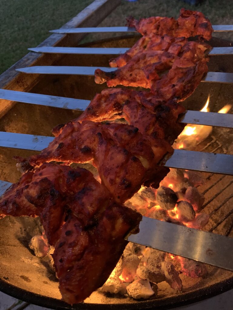 - Skewer the chickens on flat skewers or lay on the BBQ grill. These are the skewers we use: https://amzn.to/3SYgYzR